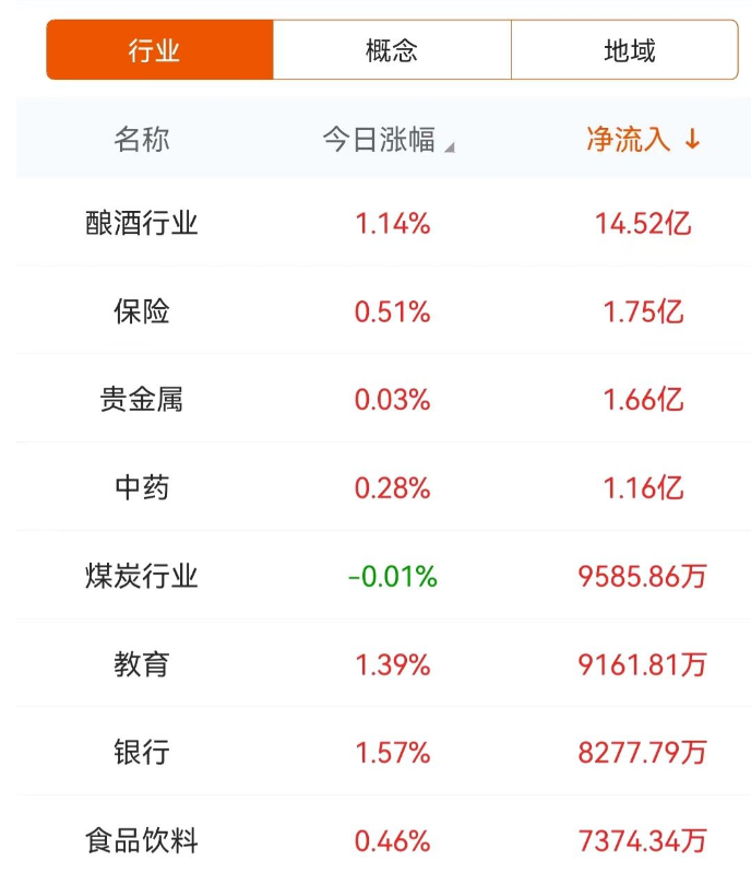 今日市场中,酿酒、保险等板块受到主力资金的青睐,净流入显著。其中,酿酒板块的主力资金净流入达到14.52亿元,显示出市场对其的看好态度。