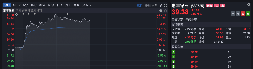 此外,培育钻石市场也展现出巨大潜力。早间,培育钻石概念强势上攻,板块指数盘初一度直线拉升涨近5%。惠丰钻石最高涨近25%,午间收盘时涨幅收窄至19.77%。力量钻石、黄河旋风、潮宏基等个股也涨停或涨超10%。
