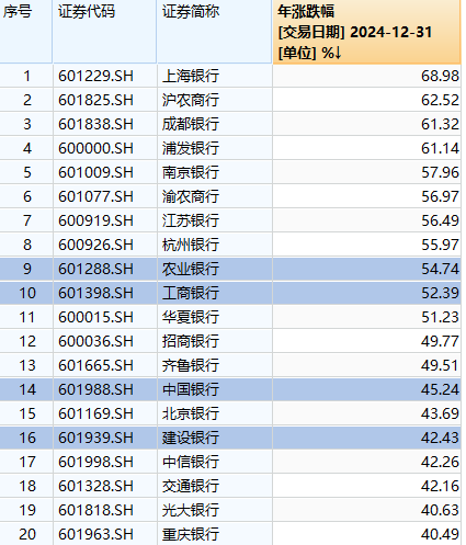 上证报中国证券网讯(记者费天元)随着2024年A股市场的圆满落幕,各行业板块表现各异,精彩纷呈。依据31个申万一级行业的划分标准,银行板块凭借34.39%的年度强劲涨幅,傲视群雄,稳居涨幅榜首位。其中,上海银行、沪农商行、成都银行、浦发银行等龙头股表现尤为抢眼,年度涨幅均突破了60%的大关,而中、农、工、建四大国有银行的涨幅也均超过了40%,成为市场关注的焦点。