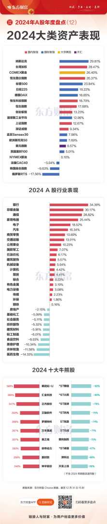 根据东方财富Choice数据显示,银行板块以34.39%的年涨幅,高居2024年行业涨幅榜榜首,成功收复过去四年连续下跌的失地。非银金融和通信行业紧随其后,年涨幅均达到了30%左右,成为市场中的佼佼者。