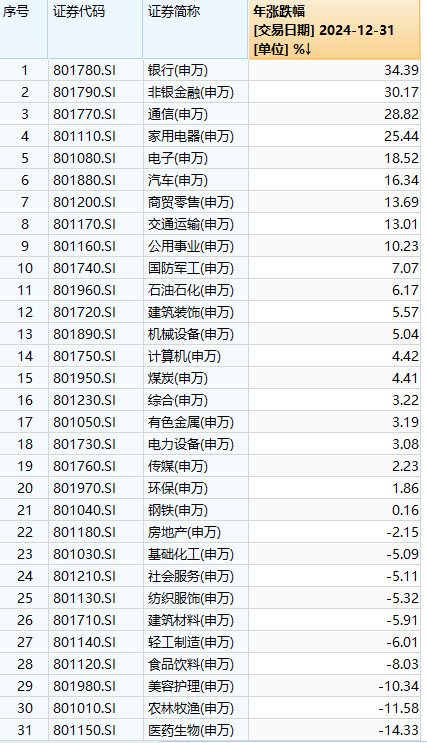 2024年A股行情收官,银行板块表现亮眼,非银金融行业紧随其后,通信行业位居第三。医药生物行业跌幅最大,农林牧渔、美容护理等行业也表现不佳。