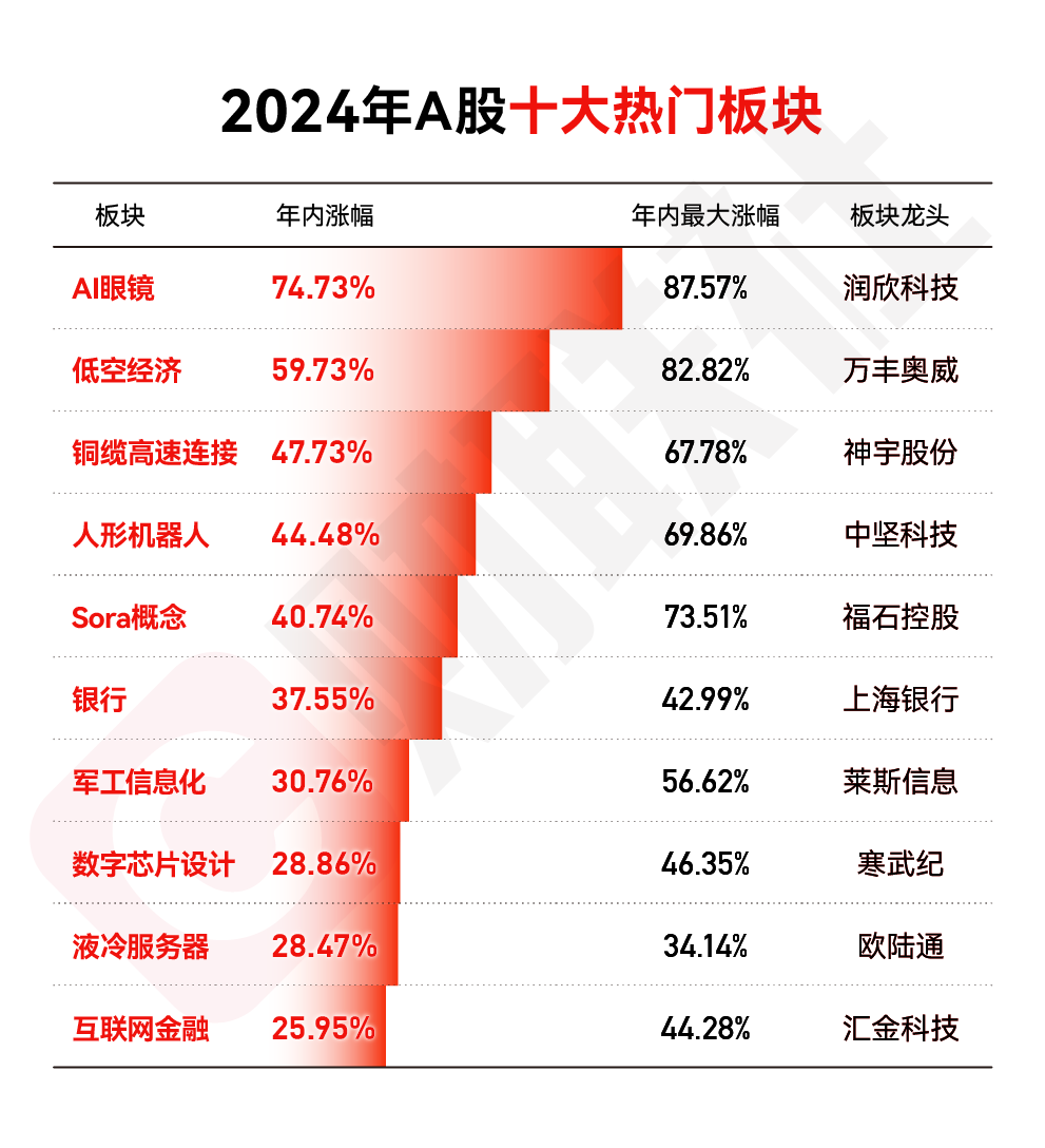 今年A股市场波动显著,催生了一系列投资热点。2月的市场反弹中,Sora概念、低空经济等题材崭露头角;下半年“9.24行情”中,AI眼镜、机器人等概念再度崛起,吸引了大量投资者关注。同时,银行股红利风格贯穿全年,成为市场焦点。其中,AI眼镜板块全年涨幅高达74.73%,低空经济涨幅亦超过50%。