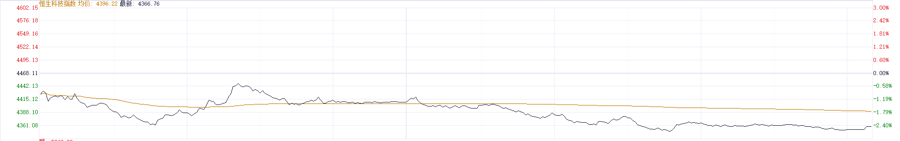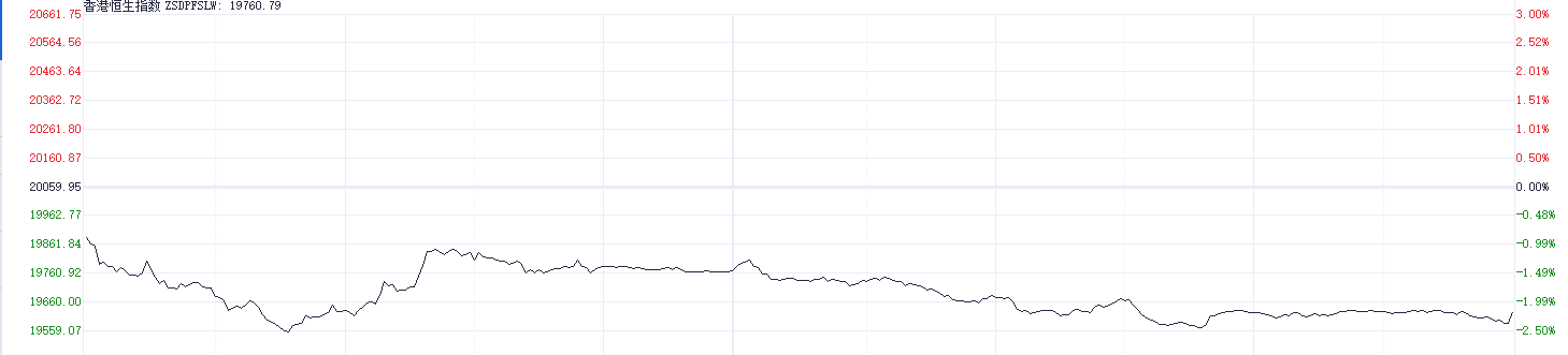 具体数据显示,恒生指数收盘下跌2.18%,报收19623.32点;科技指数收盘下跌2.47%,报收4357.53点;国企指数收盘下跌2.73%,报收7090.56点。从盘面来看,恒生指数开盘后小幅走低,并维持震荡下行的趋势,科技指数和国企指数也呈现相似的下跌走势。