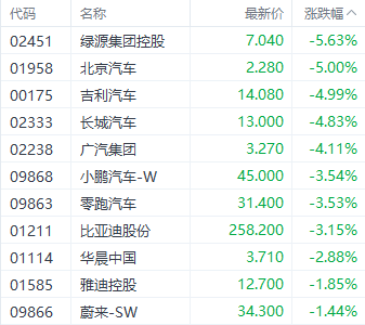 汽车股中,北京汽车(01958.HK)、吉利汽车(00175.HK)、广汽集团(02238.HK)分别下跌5%、4.99%、4.11%。尽管多家车企发布了2024年12月份的销售数据,但汽车股仍持续下跌,可能与市场价格战有关。同时,理想汽车、蔚来和乐道等车企推出购车补贴政策,但未能提振市场信心。
