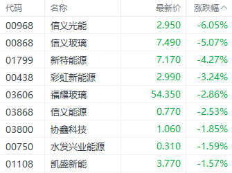 光伏股同样表现不佳,信义光能(00968.HK)、信义玻璃(00868.HK)、新特能源(01799.HK)分别下跌6.05%、5.07%、4.27%。信义光伏预计2024年净利润同比大幅减少70%至80%,市场供求失衡及市价大幅下降是导致收益及毛利下降的主要原因。