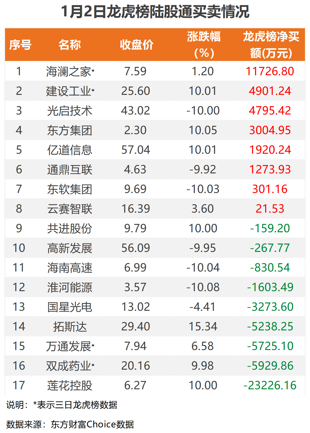 1月2日,A股市场单边下行,创业板指领跌,沪指失守3300点。北向资金当日成交活跃,沪深港通十大成交股出炉,贵州茅台、宁德时代等蓝筹股受外资青睐。陆股通龙虎榜显示,多只个股涉及外资买卖。
