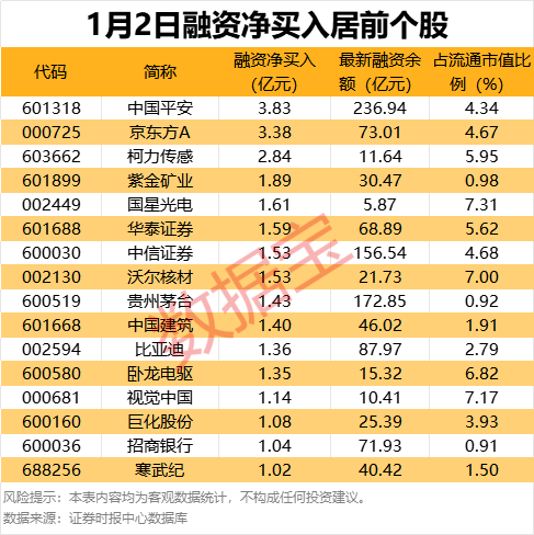 在个股方面,1月2日获融资净买入千万元以上的个股有252只,其中16只个股融资净买入额超过亿元。中国平安以3.83亿元的净买入额位居榜首,京东方A、柯力传感紧随其后,净买入金额分别为3.38亿元、2.84亿元。此外,紫金矿业、国星光电、华泰证券等个股也获得大额融资净买入。
