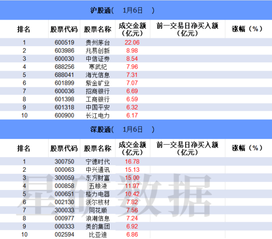 沪股通前十大成交个股中,贵州茅台独占鳌头,兆易创新和中信证券紧随其后。深股通方面,宁德时代领衔,中兴通讯和东方财富分列二、三位。