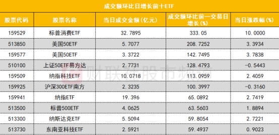 沪深300ETF(510300)成交额居首,标普消费ETF(159529)因涨停成交额环比大增333%,位居增长榜首位。