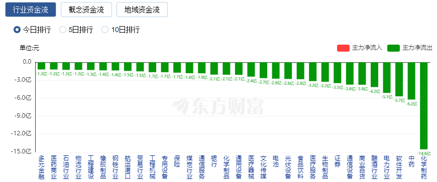 行业资金流向方面,截至午间收盘,光学光电子和半导体等行业资金净流入排名靠前,其中光学光电子净流入达6.9亿元。而化学制药和中药等行业则资金净流出排名靠前,化学制药净流出更是高达14.6亿元。