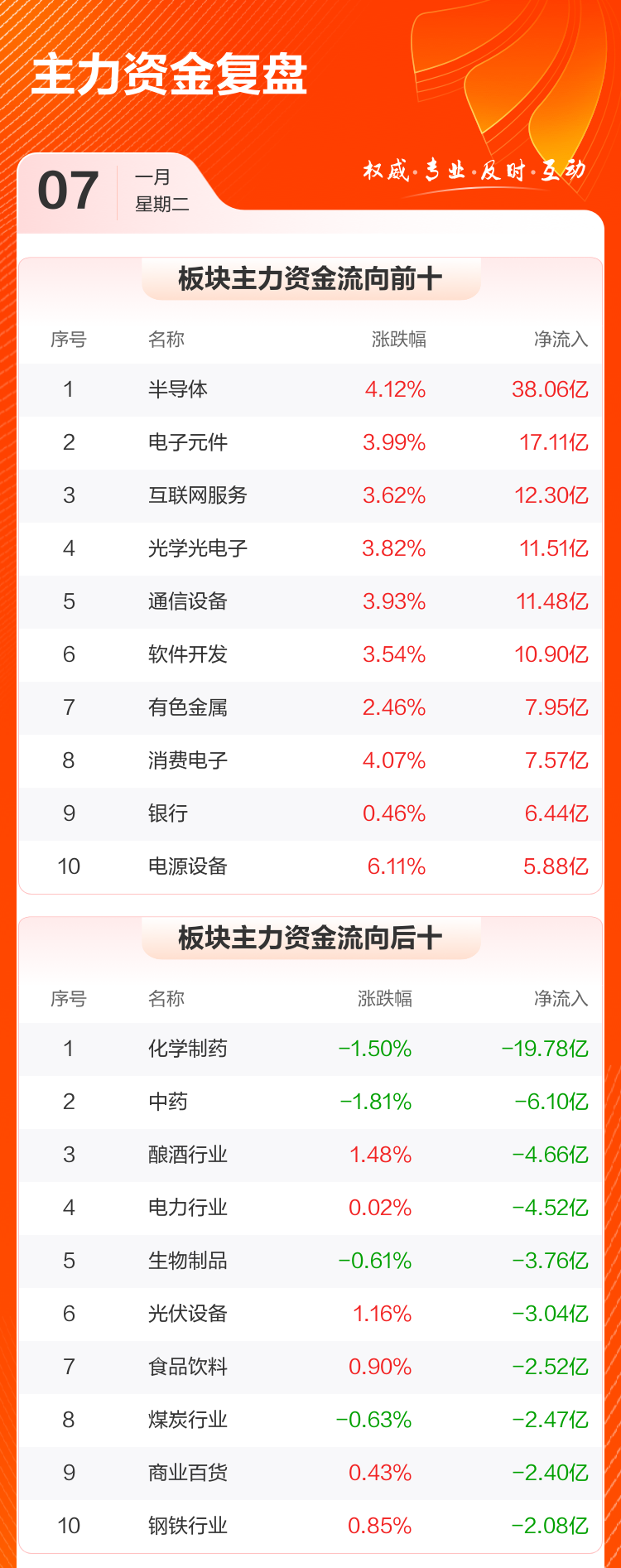 数据显示,周二大盘主力资金净流入达到119.54亿元。其中,半导体、电子元件以及互联网服务等板块的主力资金流入排名靠前,尤其是半导体板块,净流入额高达38.06亿元。