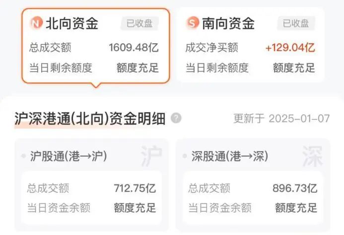 1月7日,A股市场震荡反弹,三大指数均实现小幅收涨。北向资金当日成交金额为1609.48亿元,占沪深两市总成交额的14.95%。
