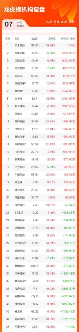1月7日,共有85只个股(包括2只可转债)登上龙虎榜,总上榜成交额达到151.91亿元。其中,净买入额最高的是汇金科技,金额高达2.36亿元。