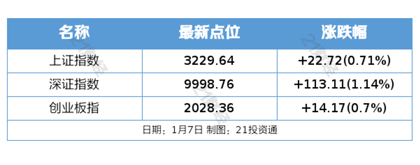1月7日A股市场震荡反弹,中小盘题材股活跃;纽约股市三大股指集体下跌;中共中央、国务院发布深化养老服务改革意见;国务院办公厅印发政府投资基金高质量发展指导意见。