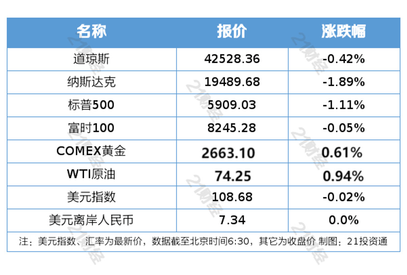 欧洲三大股指则涨跌不一,英国富时100指数下跌0.05%,法国CAC40指数上涨0.59%,德国DAX指数上涨0.62%。