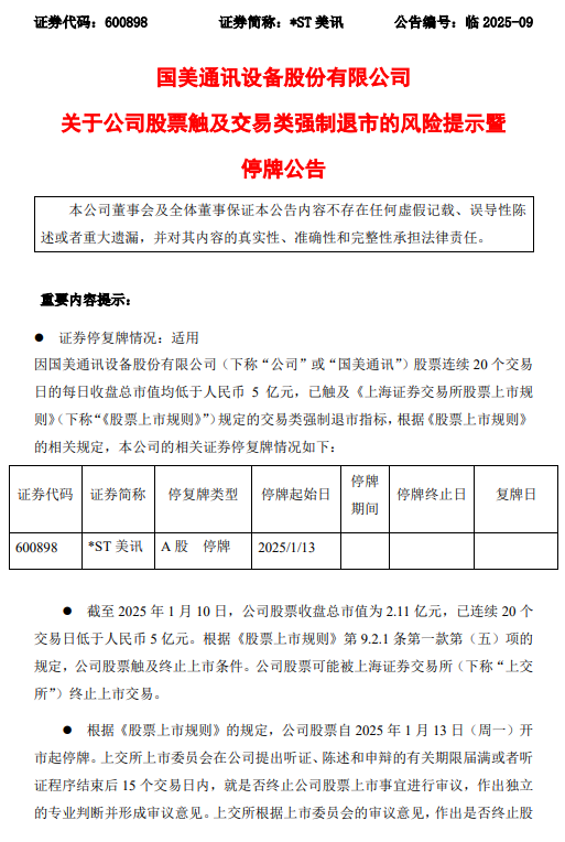 *ST美讯因连续20个交易日市值低于5亿元,触及交易类强制退市标准,股票将于2025年1月13日起停牌,等待上交所上市委员会审议是否终止上市。