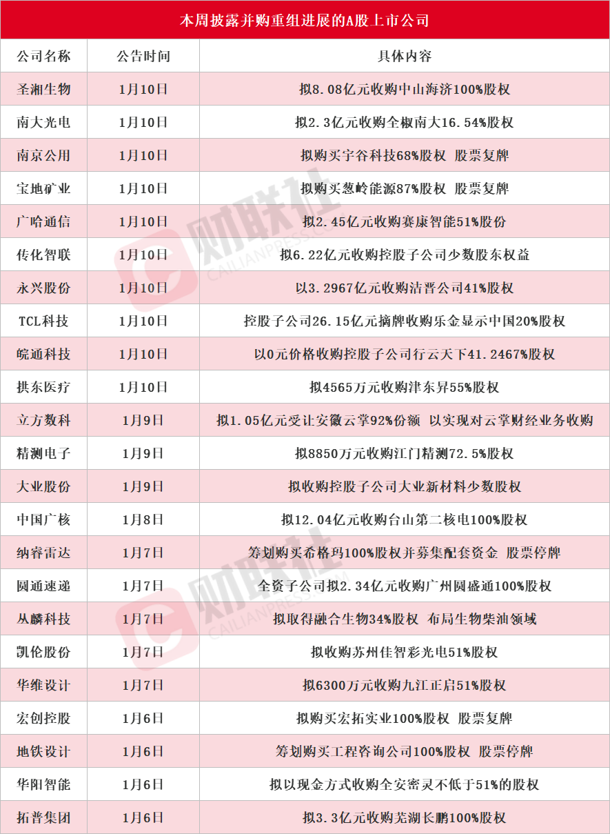 据财联社统计,截至本周发稿,共有23家A股上市公司披露了并购重组进展,包括圣湘生物、南大光电、南京公用、宝地矿业、广哈通信、传化智联、永兴股份、TCL科技、皖通科技、拱东医疗、立方数科、精测电子、大业股份、中国广核、纳睿雷达、圆通速递、丛麟科技、凯伦股份、华维设计、宏创控股、地铁设计、华阳智能和拓普集团等,具体情况详见附图。