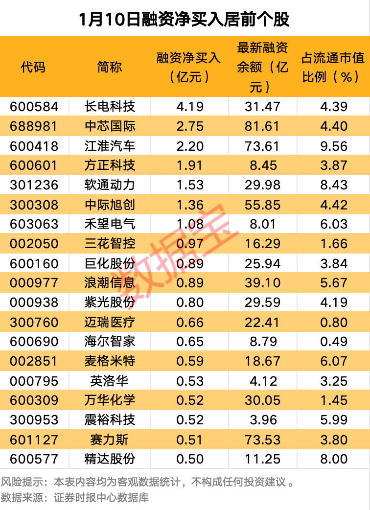融资市场方面,截至1月10日,市场融资余额为18078.77亿元,环比下降88.61亿元,连续三日减少。行业融资余额分化明显,家用电器、轻工制造、钢铁、房地产行业融资余额有所增加,而计算机、非银金融、电子行业融资余额减少较多。个股方面,1月10日有146只股票获融资净买入超千万元,其中19只股票净买入额超过5000万元,长电科技、中芯国际、江淮汽车位居前列。