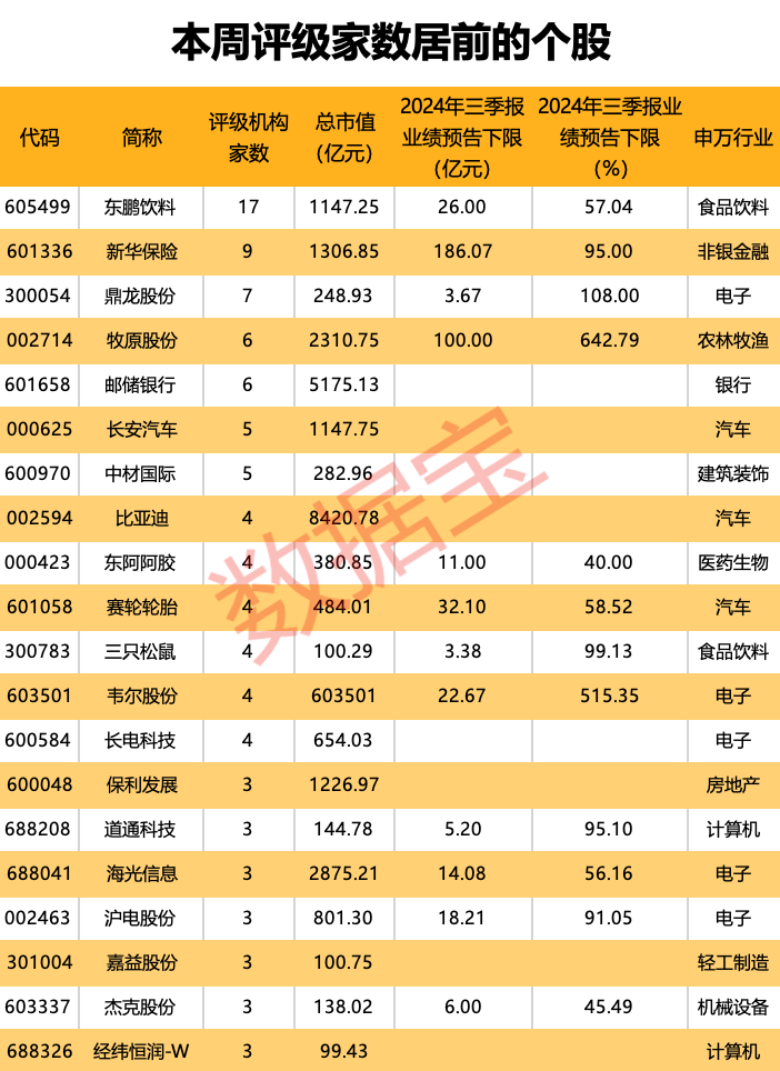 在众多获评股票中,东鹏饮料以其卓越的三季度业绩预告脱颖而出,共获得17家机构评级。新华保险则以9家机构评级紧随其后,鼎龙股份、韦尔股份、长电科技、海光信息、沪电股份等半导体个股也均获得3家以上机构评级。这些个股的三季报业绩预告均表现亮丽。