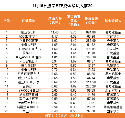 在具体表现上,1月15日共有7只ETF资金净流入超过1亿元。其中,易方达基金旗下的创业板ETF资金净流入高达11.43亿元,位居首位;万家基金旗下的A500ETF基金和华安基金旗下的创业板50ETF分别位列第二和第三,资金净流入分别为4.17亿元和4.02亿元。