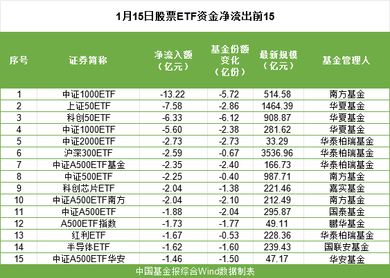 然而,1月15日也有部分ETF资金净流出较大,其中南方基金旗下的中证1000ETF以13.22亿元的资金净流出位居首位。数据显示,当日跟踪中证1000指数的ETF合计资金净流出超过20亿元。