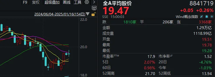 早盘前15分钟,市场一度高开高走,似乎预示着普涨行情的再现。然而,从9:45至13:12,三大指数相继回落,一度集体翻绿。但随后市场跌势明显止住,截至收盘,三大指数均收红,仅科创50指数出现下跌。全A平均股价也收出一根“假阴线”,实际上涨0.26%。