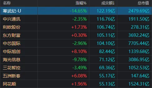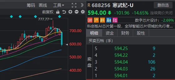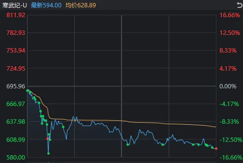个股方面,被视为国内AI领域龙头的寒武纪股价遭遇大幅波动。早上9:45起,随大盘回落后,寒武纪持续遭大单抛售,股价快速跳水,最低跌至580元,收盘价为594元。相较上周五盘中最高价777.77元,最大回撤幅度达到了34%。整个科技线尤其是AI芯片股也随之承压。