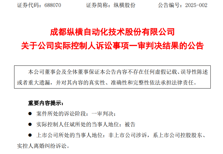纵横股份实控人任斌离婚案一审宣判,其持有的公司股票被判决分割给前妻,涉及市值高达4.3亿元。任斌表示将提起上诉,但预计本次诉讼不会对纵横股份的实际控制权产生重大影响,公司生产经营正常。
