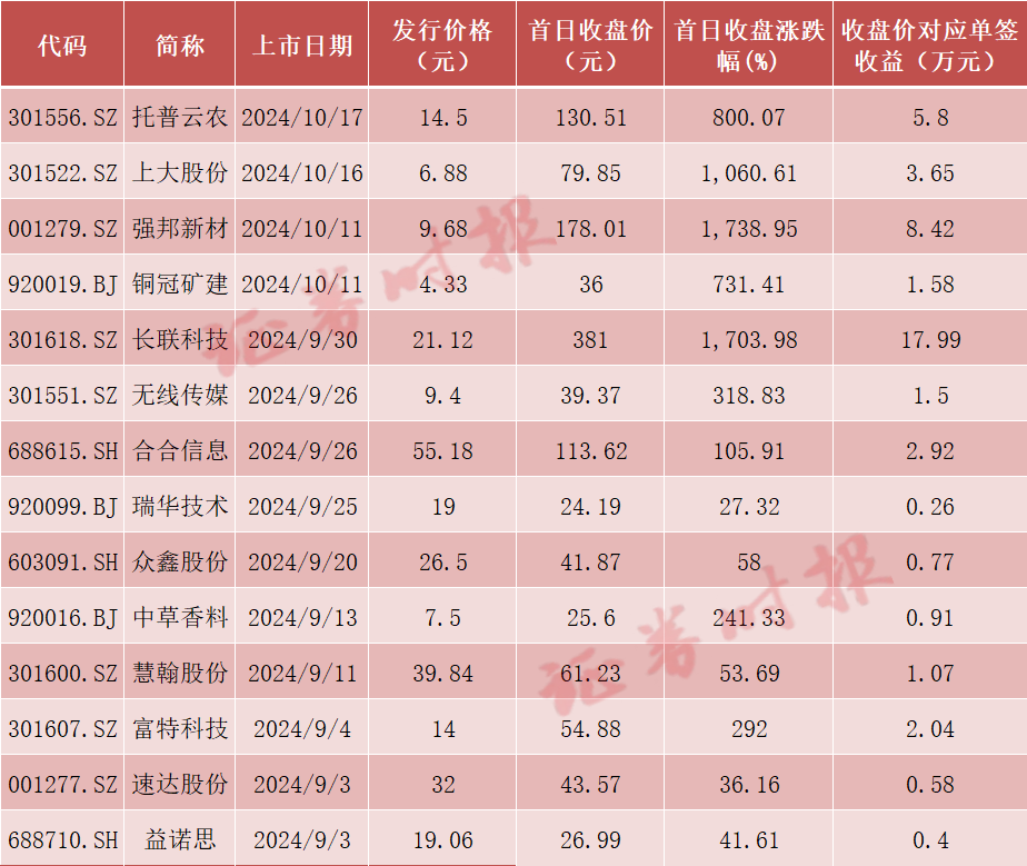 9月30日,主营印花材料的新股长联科技上市首日即实现超17倍涨幅,收盘涨幅高达1703.98%。若中签500股,收盘时的单签收益可达17.99万元,成为今年新股中最大的“肉签”。这一事件进一步激发了投资者对新股的热情。