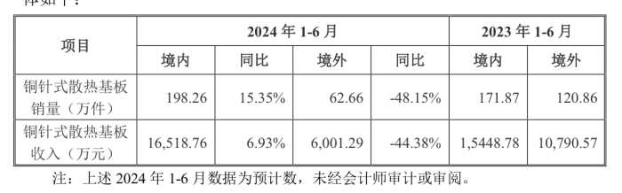 尽管黄山谷捷在过去几年中营业收入和净利润均呈现逐年增长的态势,但2024年上半年,受海外新能源汽车政策调整、产品单价下滑和铜价持续上涨等因素影响,公司业绩出现下滑。其中,核心产品铜针式散热基板境外销售量及销售金额均大幅下滑。