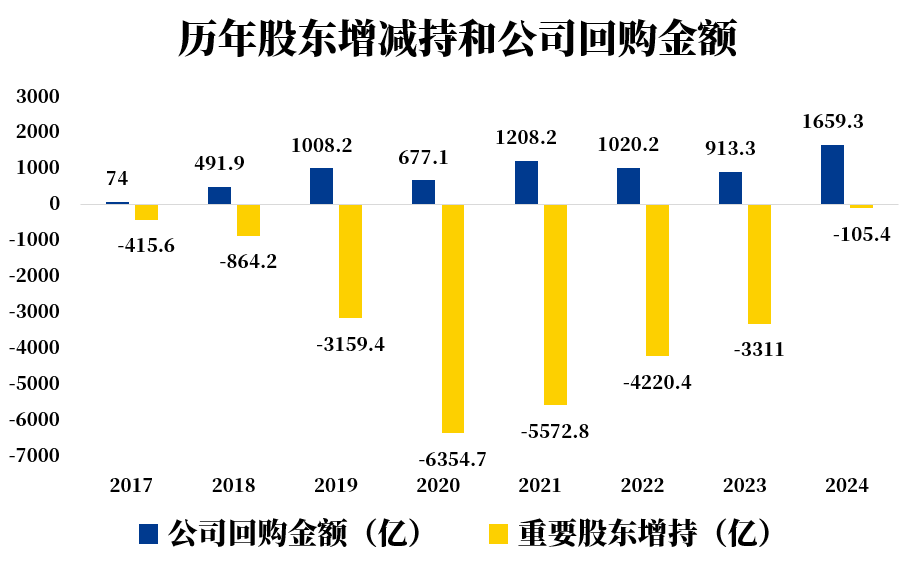 2024年,随着新“国九条”的推出,A股市场逐渐从“融资市”向“投资市”转变,制度层面更加强调“以投资者为本”。在这一背景下,2024年全年股东增持和公司回购情况明显改善。截至2024年12月31日,上市公司回购金额超过1659.3亿元,大幅超越过往年份。同时,上市公司重要股东由去年全年净减持超3300亿元转变为减持105亿元,对市场资金面的消耗大幅下降。随着市场结构的优化、中长期资金的入市以及资本市场创新政策的推出,A股市场的生态已经发生了内生性变化。