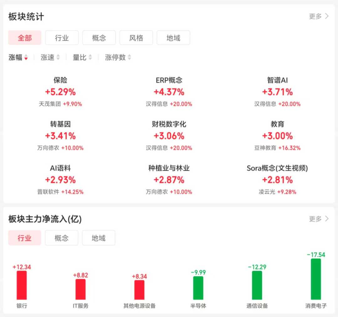 板块方面,保险板块以5.29%的涨幅领涨市场,教育、种植业与林业、多元金融、IT服务、银行等板块亦表现活跃,涨幅均超过2%。其中,银行板块吸引主力资金净流入居首,达到12.34亿元,显示出资金对银行股的青睐。