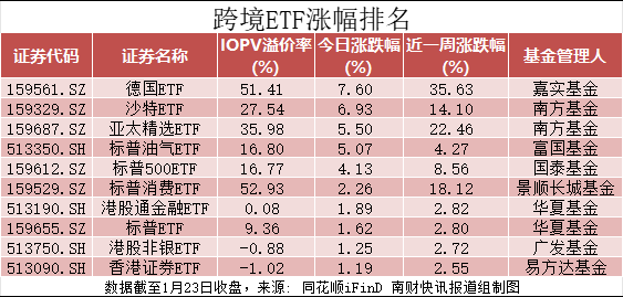 1月23日,跨境ETF市场再度走强,多只ETF出现大幅溢价并触发临时停牌。其中,嘉实基金旗下的德国ETF领涨市场,溢价率超过50%。南方基金旗下的沙特ETF和亚太精选ETF也同步刷新历史高点。