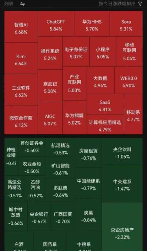 在行业板块方面,AI智能体、Sora概念、软件开发及鸿蒙概念等板块表现尤为突出,位居涨幅榜前列。相反,白酒、中药、房地产及大豆等板块则走势疲软,位居跌幅榜前列。