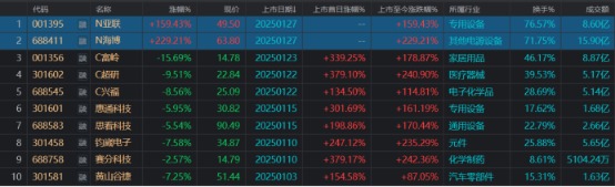 今日(1月27日),N亚联、N海博分别成功登陆深主板与科创板,市场反响热烈。截至收盘,两者首日上市涨幅分别逼近159.43%与229.21%,若以中签500股计算,投资者首日盈利分别可达1.52万元与2.22万元。至此,2025年首月新股市场圆满收官,期间共有12只新股上市,且首日均实现翻倍增长。