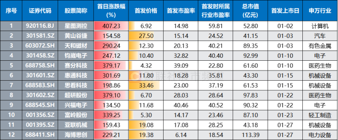从首日表现来看,本月新股均实现翻倍增长,平均涨幅达到268.4%,与去年12月水平相近,但远高于去年1月。其中,星图测控首日大涨407.2%,位居月内新股涨幅榜首位,赛分科技、超研股份、富岭股份、惠通科技等也表现不俗,首日涨幅均在3倍以上。尽管部分个股随后出现调整回落,但星图测控涨幅持续扩大。