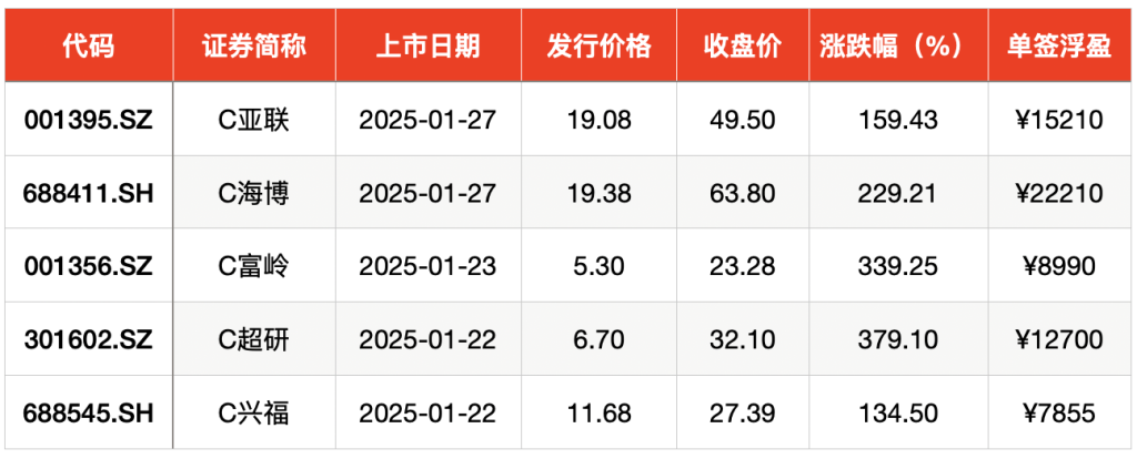 具体来看,兴福电子在科创板上市,发行价格为11.68元/股,上市首日收盘价27.39元,涨幅达134.50%;超研股份在创业板上市,发行价格为6.70元/股,上市首日收盘价32.10元,涨幅高达379.10%;富岭股份在深市主板上市,发行价格为5.30元/股,上市首日收盘价23.28元,涨幅为339.25%;海博思创同样在科创板上市,发行价格为19.38元/股,上市首日收盘价63.80元,涨幅达到229.21%;亚联机械在深市主板上市,发行价格为19.08元/股,上市首日收盘价49.50元,涨幅为159.43%。