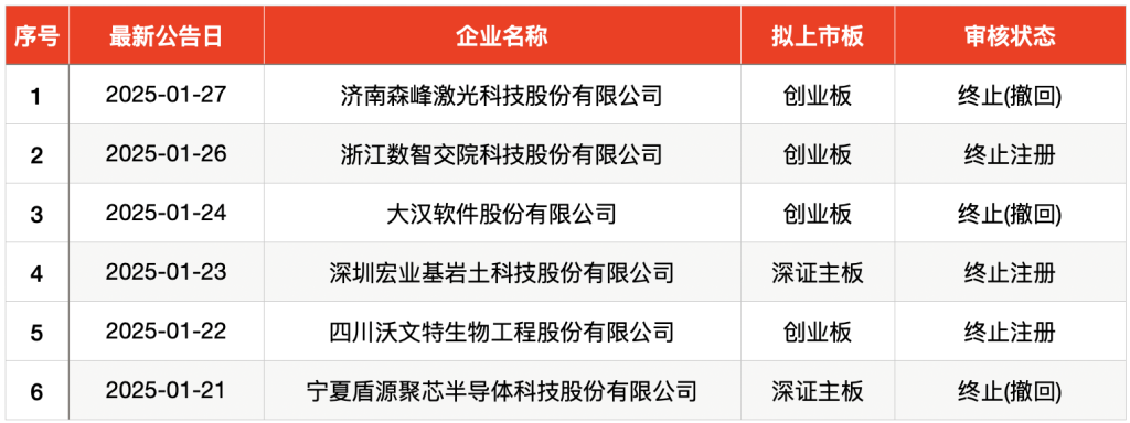 此外,1月20日至1月27日期间,A股市场还有6家企业IPO终止,包括济南森峰激光科技股份有限公司、大汉软件股份有限公司、宁夏盾源聚芯半导体科技股份有限公司等企业主动撤回申请,以及浙江数智交院科技股份有限公司、深圳宏业基岩土科技股份有限公司、四川沃文特生物工程股份有限公司等企业终止注册。