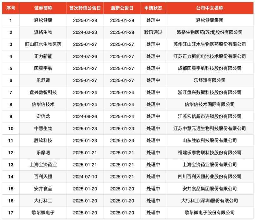 港股市场方面,古茗(01364.HK)目前正处于招股申购阶段。1月20日至1月27日期间,港股市场共有16家企业申报上市,其中首次申报的企业合计13家,包括轻松健康集团、苏州旺山旺水生物医药股份有限公司、成都国星宇航科技股份有限公司等多家企业。此外,还有3家企业更新了招股书,分别为江苏正力新能电池技术股份有限公司、江苏宏信超市连锁股份有限公司、四川百利天恒药业股份有限公司。