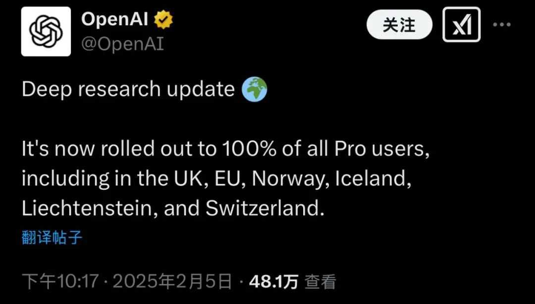 值得注意的是,OpenAI在2月5日还宣布,已向包括英国、欧盟等多个国家和地区的专业用户全面推出Deep Research功能。