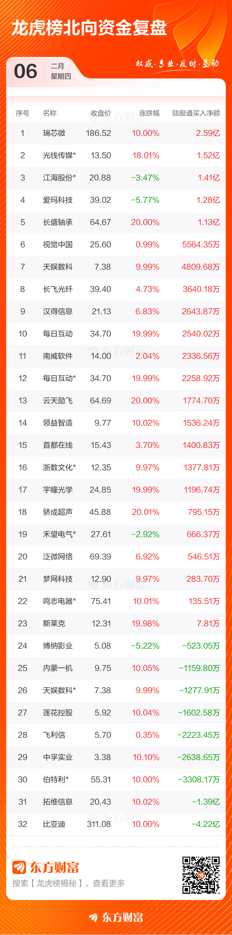2月6日龙虎榜:71只个股上榜,瑞芯微净买入额居首