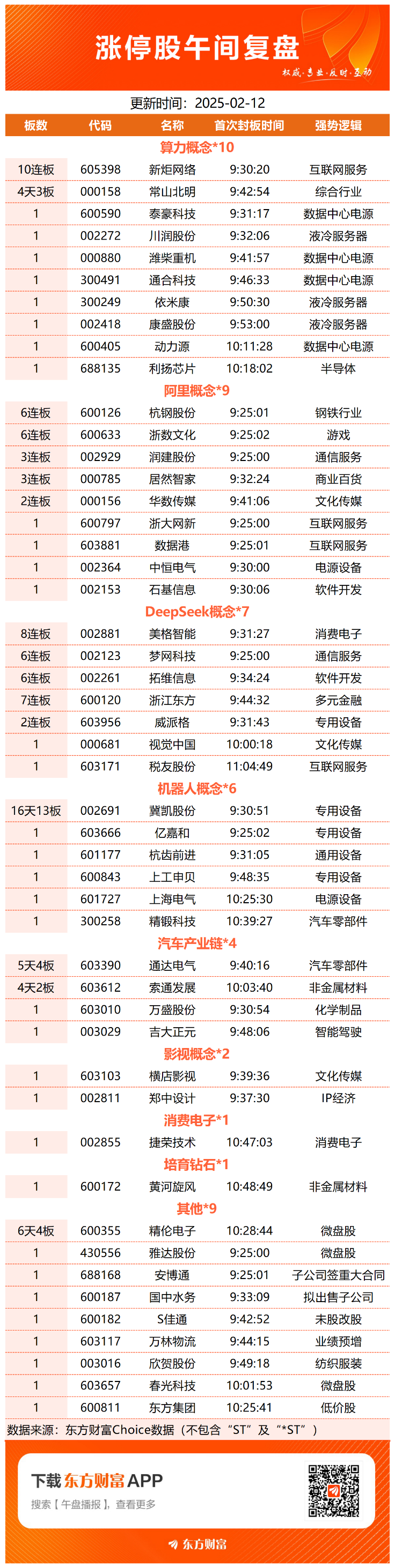 周三(2月12日)市场早盘冲高回落,三大指数涨跌不一,两市半日成交额9999亿,较上个交易日缩量356亿。截至午间收盘,沪指跌0.01%,深成指涨0.07%,创业板指涨0.09%。