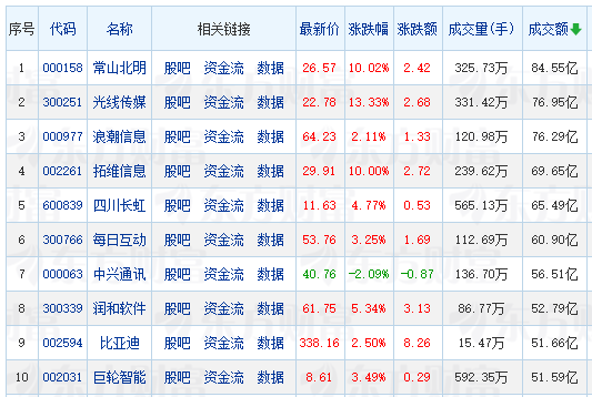 个股成交金额方面,截至午间收盘,常山北明排名第一,成交金额84.55亿元;光线传媒位列第二,成交金额76.95亿元。
