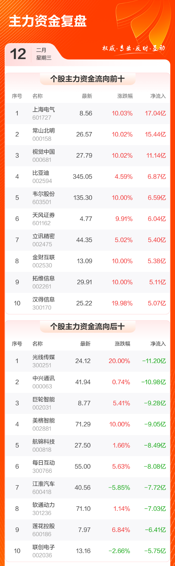 主力净卖出个股中,光线传媒排名第一,主力净卖出11.20亿元;中兴通讯排名第二,主力净卖出10.98亿元。