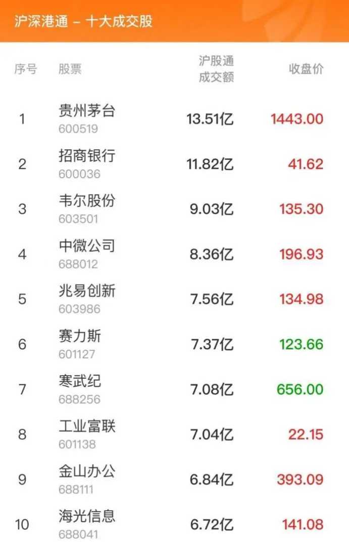 交易所公布的当日沪深港通十大成交股显示,贵州茅台、招商银行、韦尔股份位列沪股通前三,成交额分别为13.51、11.82、9.03亿元;宁德时代、比亚迪、立讯精密位列深股通前三,成交额分别为30.35、21.78、16.96亿元。