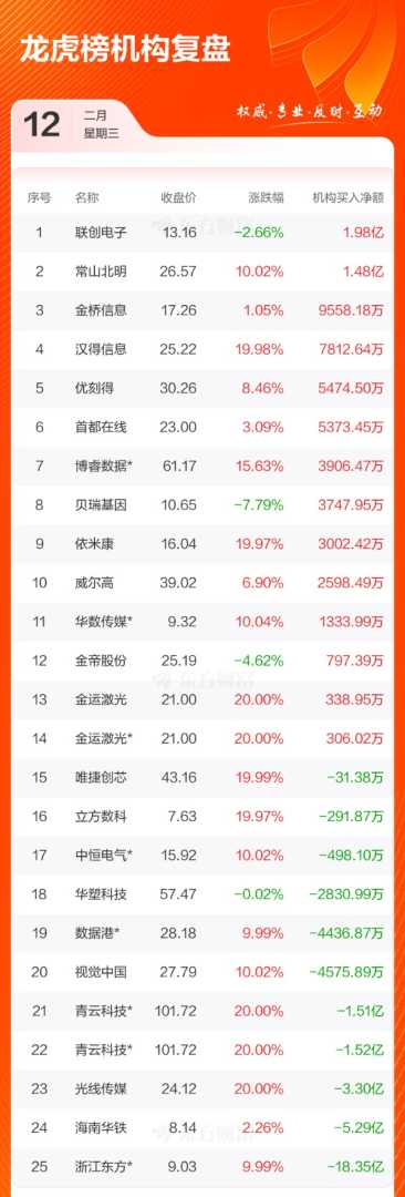 2月12日共有58只个股上榜龙虎榜,总上榜成交额221.15亿元。上榜个股中净买入额最高的是常山北明,金额为6.43亿元。