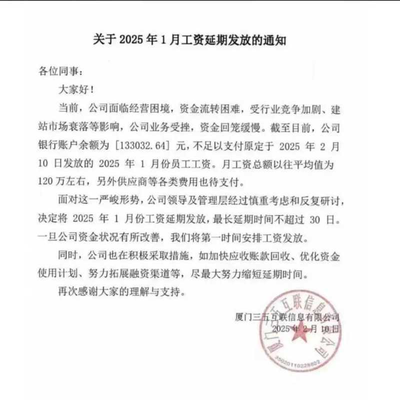 2月13日,“三五互联账上只剩13万元,发生了什么”的消息在职场社区脉脉上引发热议。三五互联发布通知称,其银行账户余额仅为133032.64元,远不足以支付2025年1月的员工工资,平均月工资总额为120万元左右,还有各类待支付款项。三五互联解释称,受行业竞争加剧、建站市场衰落影响,业务受挫,资金回笼缓慢,决定延期发放员工1月工资,最长延期不超30天。公司正在积极采取措施,包括加快应收账款回收、优化资金使用计划、努力拓展融资渠道等,以缩短延期时间。