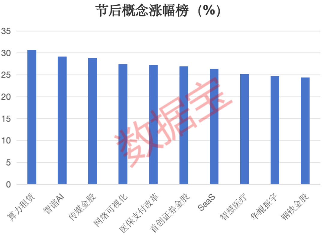 节后算力租赁指数大涨近31%,居概念板块涨幅榜首位;东数西算大涨近24%,大数据、服务器等概念指数均涨超20%。牛股表现抢眼,并行科技月内大涨两倍居A股第一,优刻得-W、青云科技-U等大涨超170%。