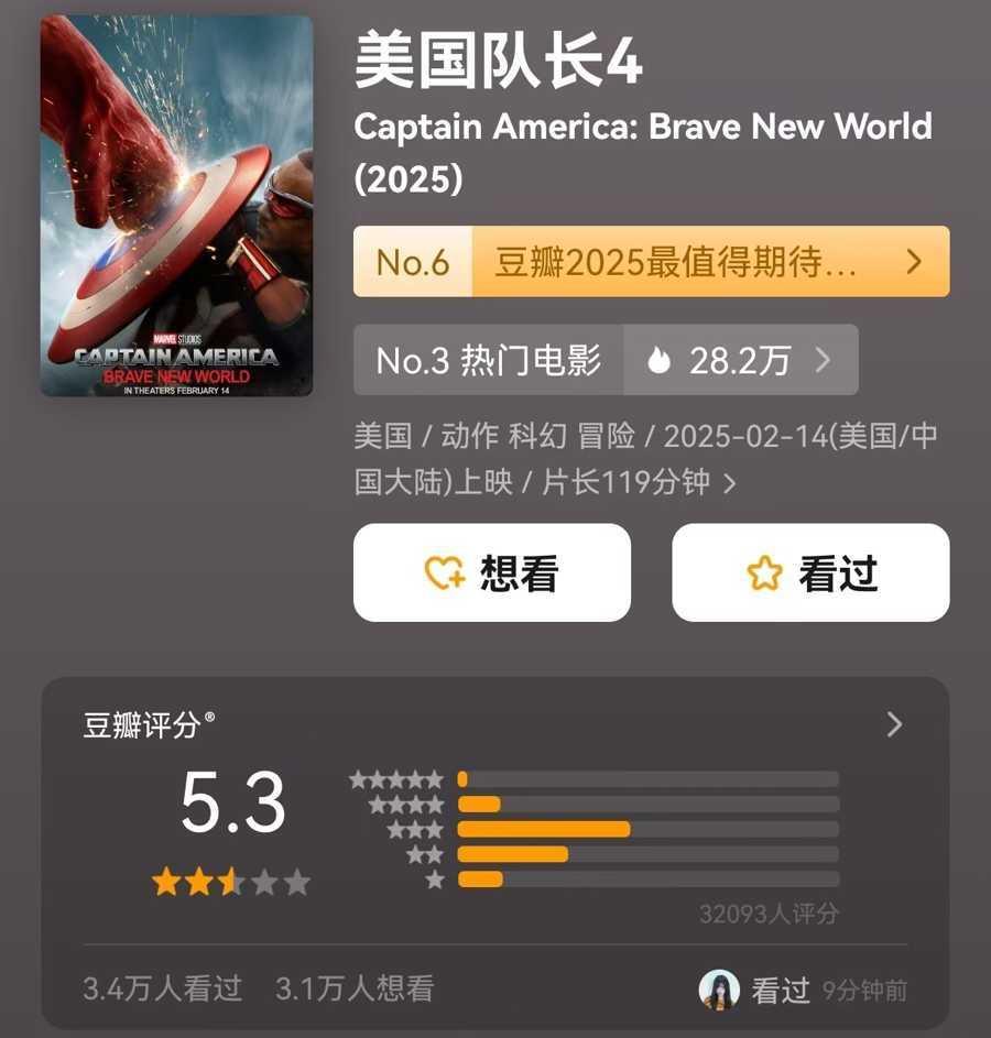 漫威新作《美国队长4》2月14日上映,票房仅8400余万元,豆瓣评分5.3,与前作差距显著。影迷对影片质量及“换人”问题吐槽不断。