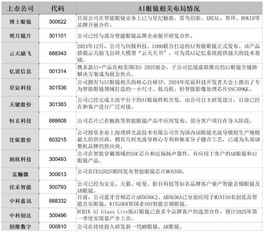 面对即将打开的巨量增长空间,诸多A股上市公司也在积极布局AI眼镜,以期在这一新兴市场中占据一席之地。